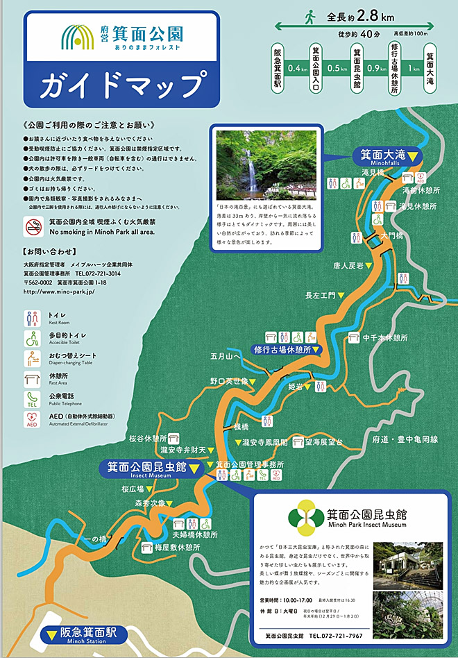 落差は33mあり、岩壁から一気に流れ落ちる様子はとてもダイナミックです。阪急箕面駅から2.8kmの表示がありますが、結構 登り・下りがあります。川沿いの「滝道」をゆっくり散策しませんか。約6Kmのコースです。