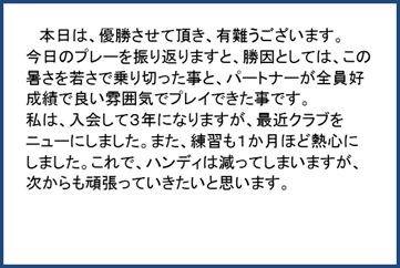 | 優勝カップ授与 鬼頭淳悟氏(右) | 世話役代表挨拶 | 優勝者 鬼頭淳悟氏 喜びの言葉 | |||||||||||||||||||||||||||||||||||||||||