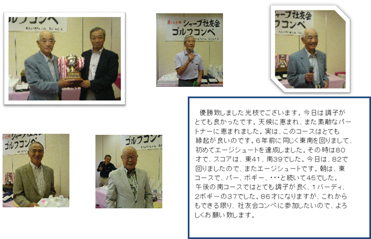 | 優勝カップ授与 光枝義正氏(左) | 世話役代表挨拶 | 優勝者 光枝義正氏 喜びの言葉 | ||||||||||||||||||||||||||||||||||||||||||