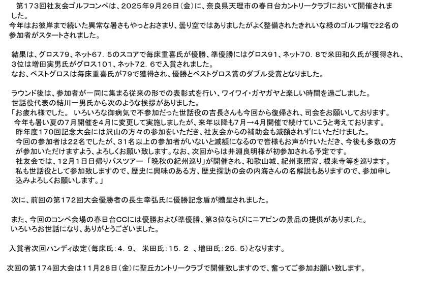 | 第173回ゴルフコンペ(春日台CC)の結果 (2025年9月26日) | 前回の結果 | |||||||||||||||||||||||||||||||||||