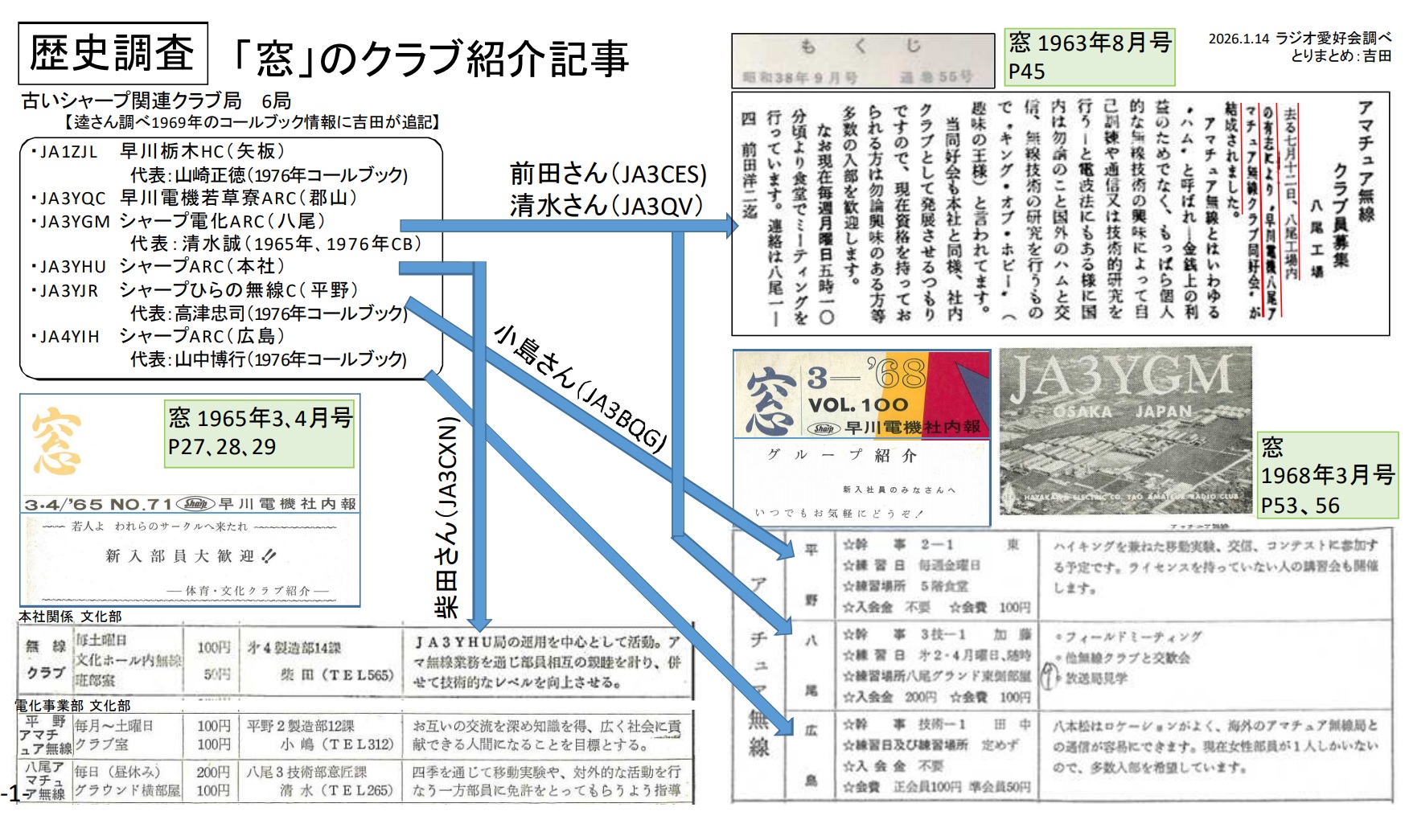 (1)放送100年に向けたNHKからの取材依頼(荒川)(2)シャープアマチュア無線の『有史以前を掘り起こすプロジェクト』 (吉田) ・現状の全体まとめ ・第1次コールサインのなぞ