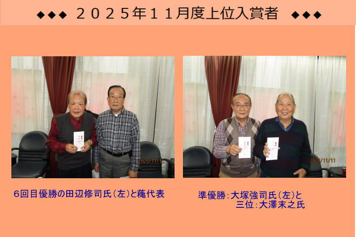 11月例会優勝:田辺修司氏、準優勝:大塚強司氏、三位:大澤末之氏 。〔例会の結果はこちらです。〕