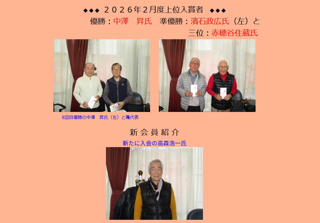 2月例会は優勝中澤 昇氏、準優勝:濱石政広氏、三位:赤穂谷住蔵氏〔例会の結果はこちらです。〕
